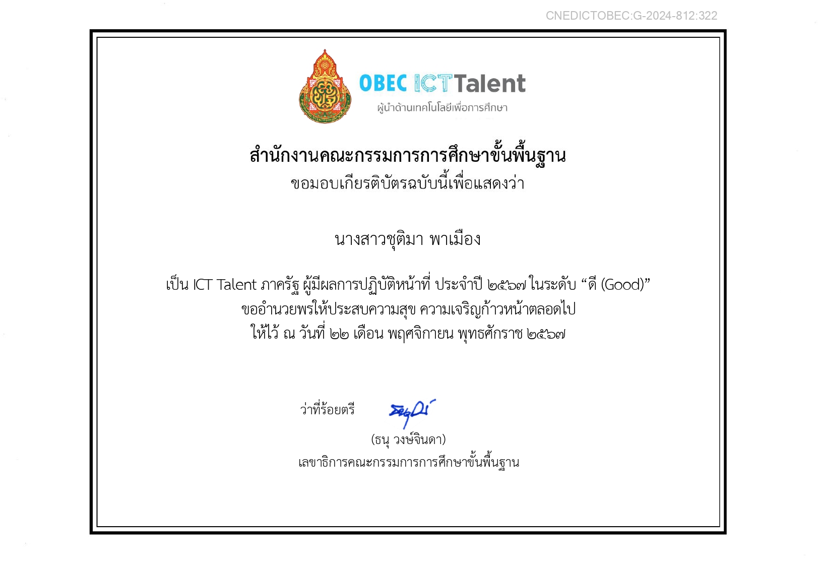 ชื่อผลงาน : ผู้มีผลการปฏิบัติหน้าที่ ICT Talent ภาครัฐ ประจำปี 2567 ในระดับ "ดี (Good)"